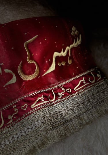 Add a special touch to the entrance of your Nikkah with our personalised and intricately designed Nikkah Dupattas. Featured at the top of the array of dupattas in the Image beside us - we have the Luxury Khadeejah Beaded & Tassel Dupatta in 'Classic Red'. Bordered with finely handcrafted lettering reading 'Baba Ki Rani' in Urdu, and a spray of beading across the net of the duppata. and a 4-sided beaded tassel border. Behind this border, are a range of some of our most popular dupattas , the 'Nüra & the 'Anaya' in colours - baby blue, Ivory/Gold, Emerald Green, Baby Pink & the Classic Red. In Islamic marriages Qabool Hai translates to 'I accept' or 'I do'. Start your new chapter in life with our elegant and refined pieces, and most importantly... WithAmore♡