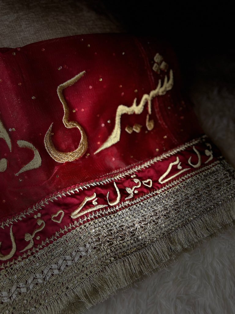 You can personalise your nikkah dupatta with names, wedding dates, meaningful verses, or any custom text of your choice. Choose from our selection of dupatta designs & simply add your details in the personalisations box when you place your order, and our design team will ensure it's beautifully embroidered on the fabric. If you need help with ideas, or would like to design your own dupatta, feel free to reach out to us!